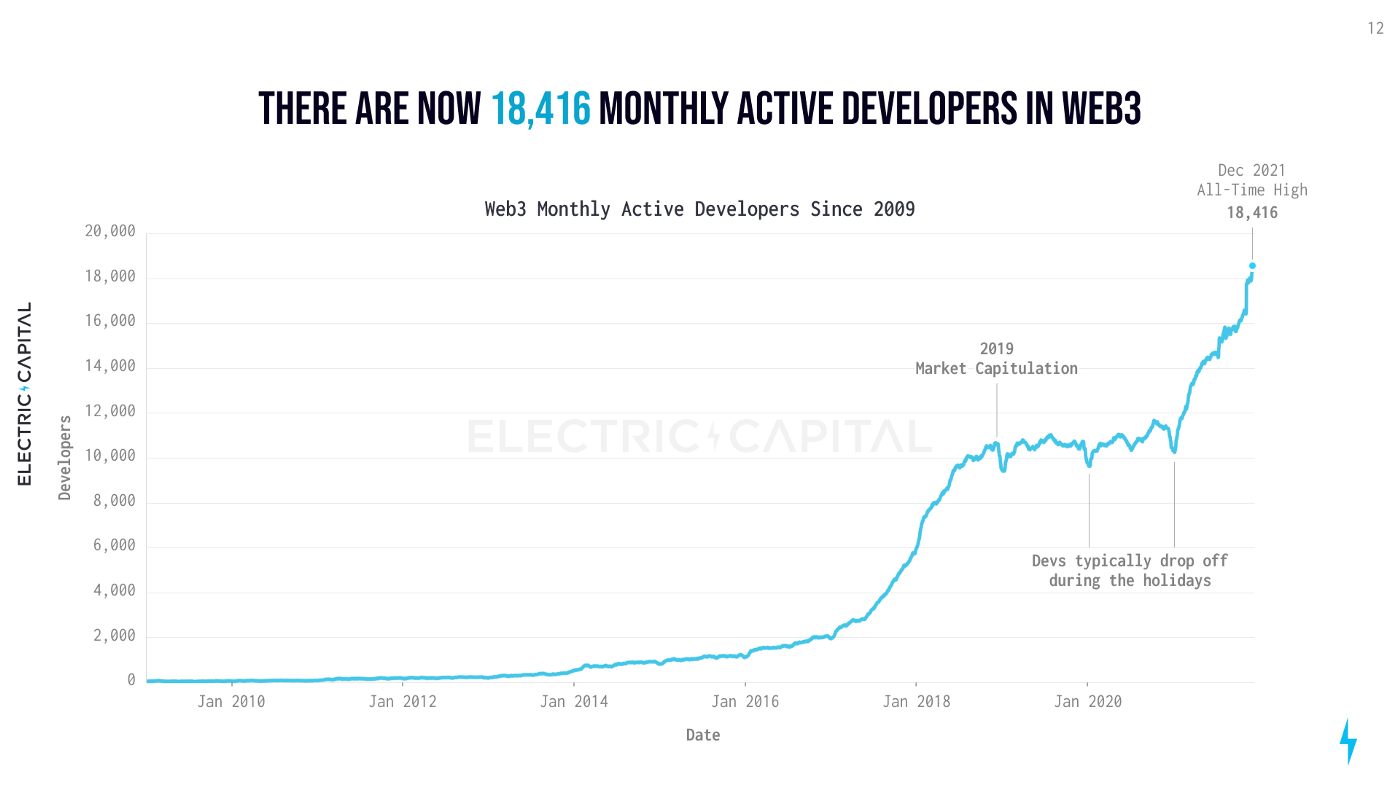 Web3 is on a massive growth trajectory. Over the past year, the number of monthly-active developers in web3 has grown by 75%, with over 34K new web3 developers in 2021 alone (opens new window)!